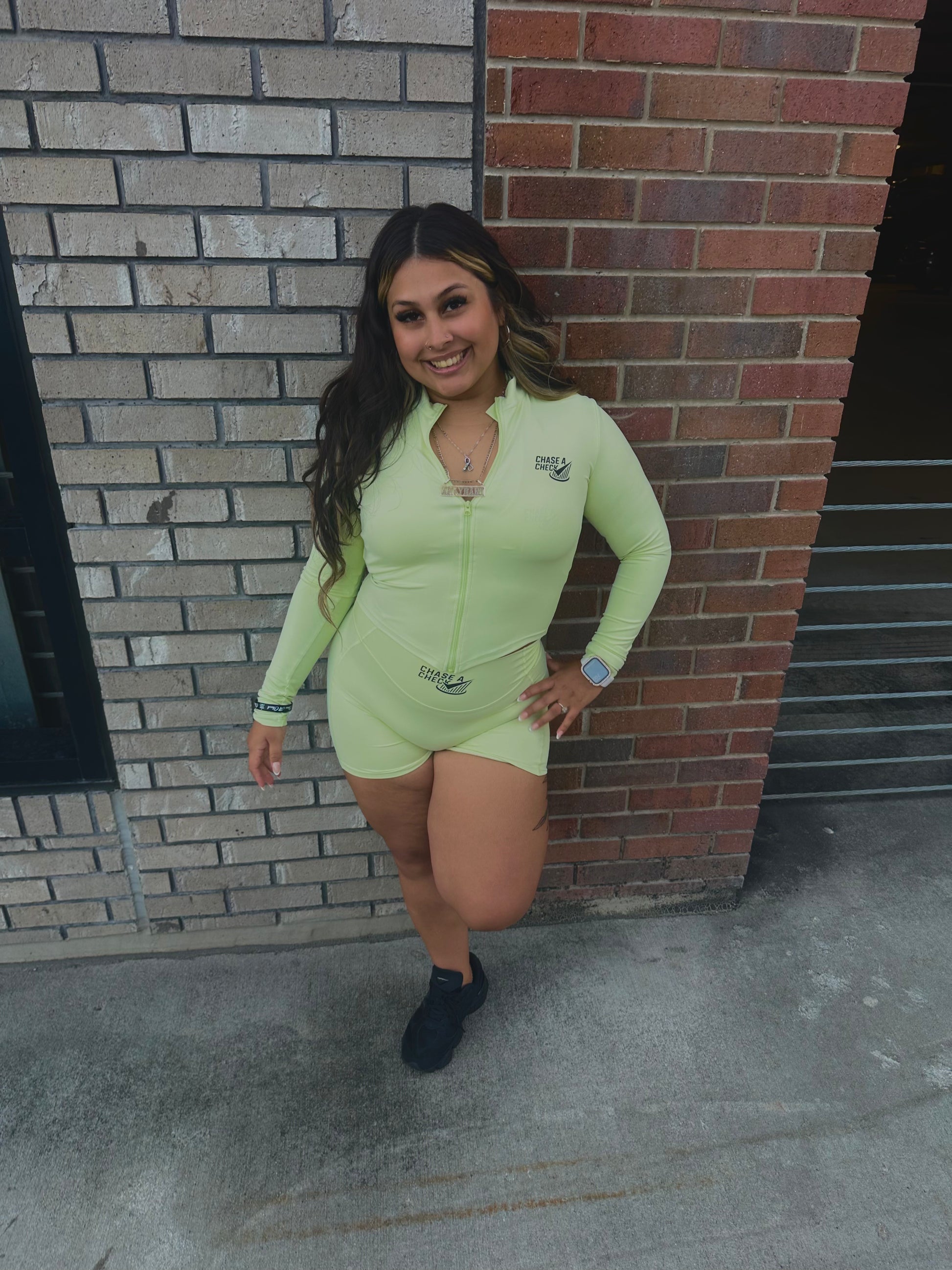 A long-sleeve zip up crop jacket featuring the “Chase A Check” logo on the chest — perfect for layering before or after workouts.